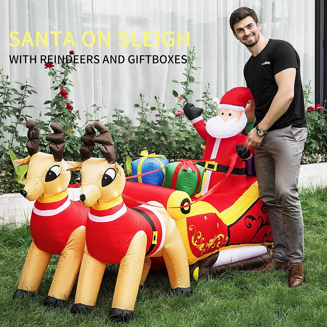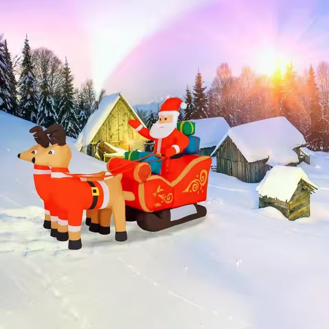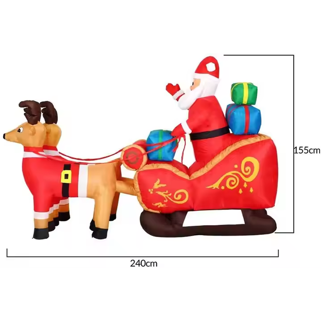 Внесете празнична магия във вашето пространство с този весел надуваем декор на Дядо Коледа, шейната и северните елени!— за по-малко от 30 секунди е готов за използване. Работи с ток, което го прави много лесен за употреба — просто го включете в контакт.
