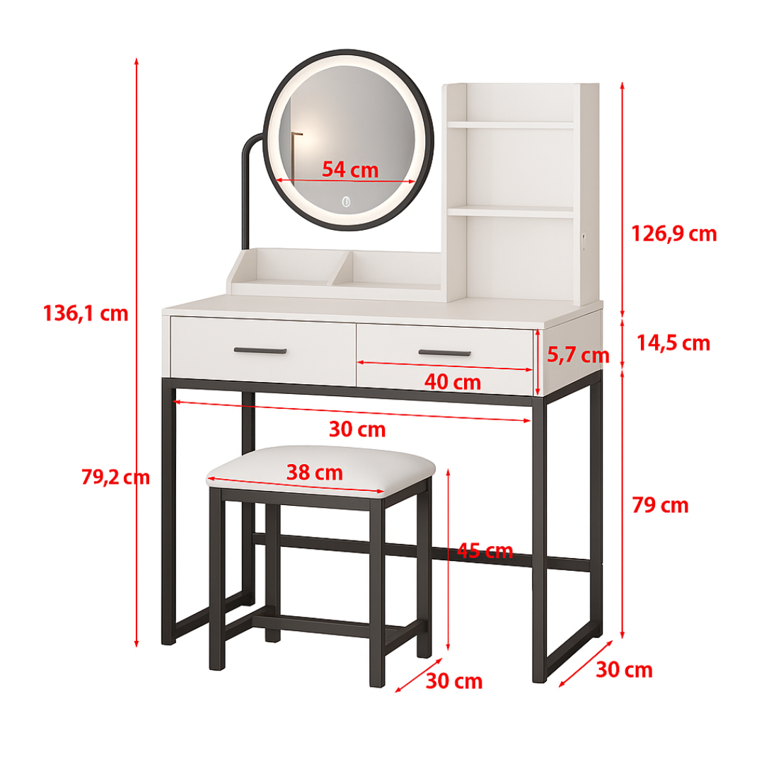 Таблицата предлага много място за съхранение – 2 просторни чекмеджета, 3 отворени рафта и 2 организатори на дъската, Благодарение на това всички ваши козметични консумативи и аксесоари винаги ще бъдат надлежно организирани под ръка.