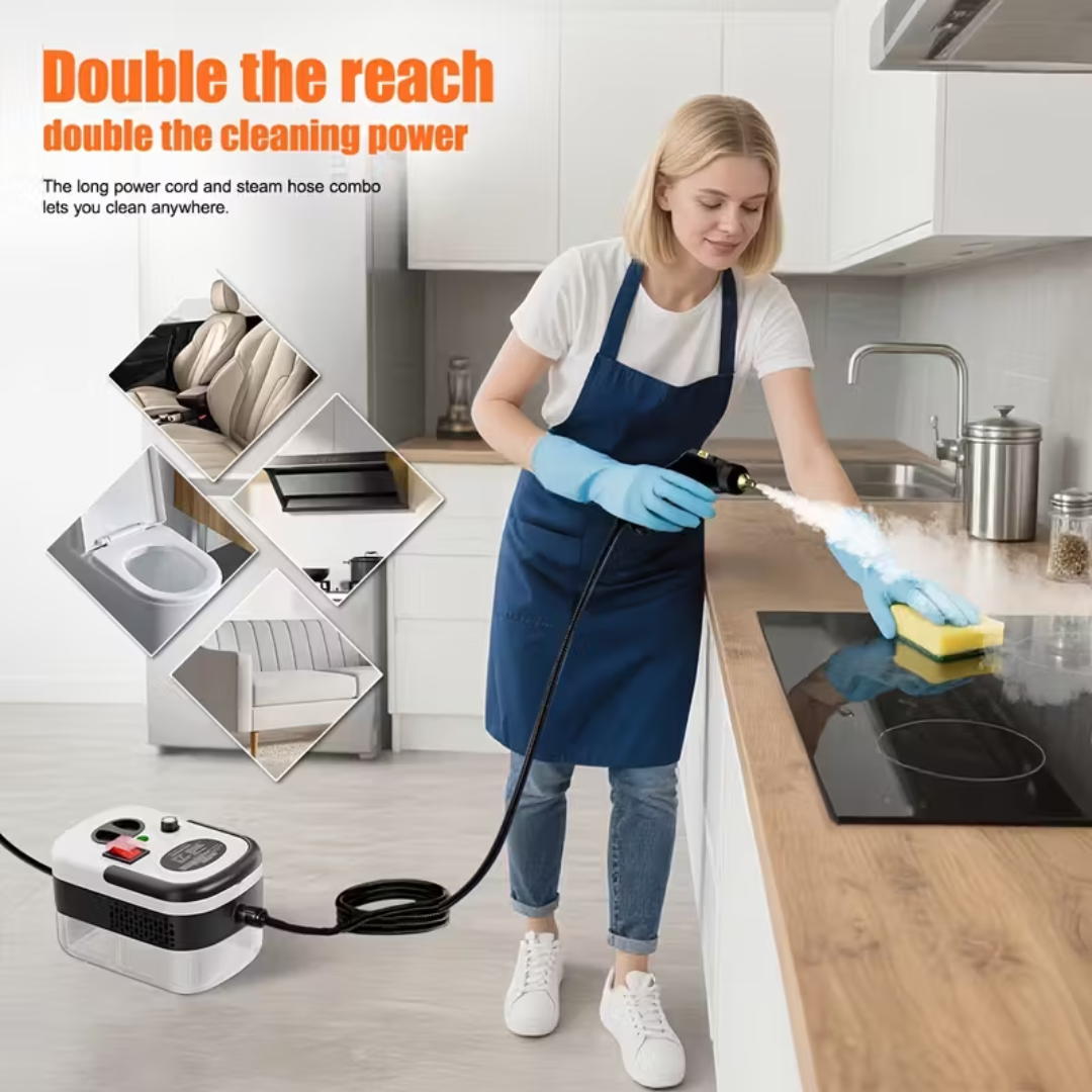 Почистете дома и колата си по естествен и ефикасен начин с нашата преносима прахосмукачка с богат комплект от 20 аксесоари. Това многоцелево устройство използва високотемпературна мощност на парите (до 130 °C) за предварително премахване на мръсотията, мазнините и бактериите – без нужда от агресивни химикали.
