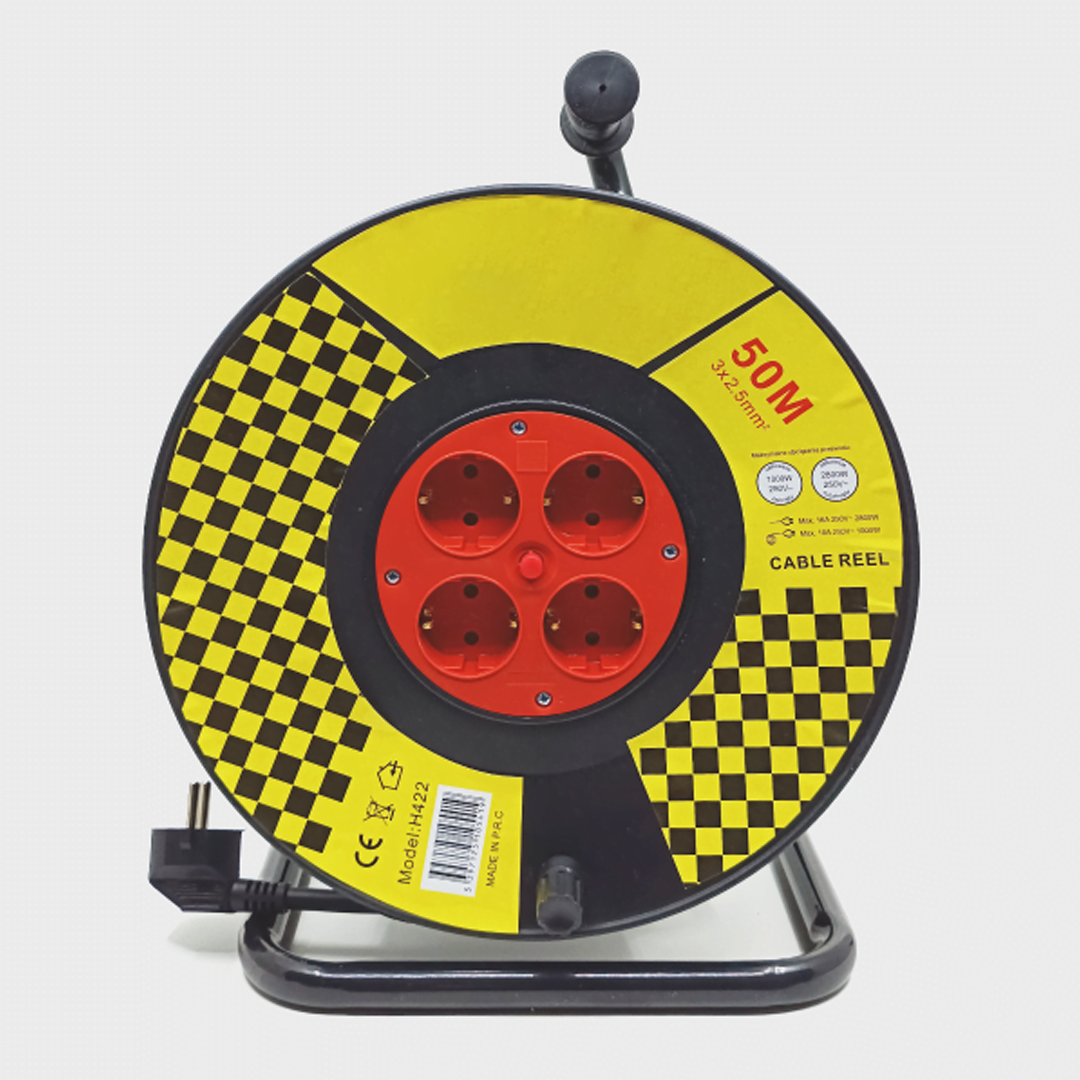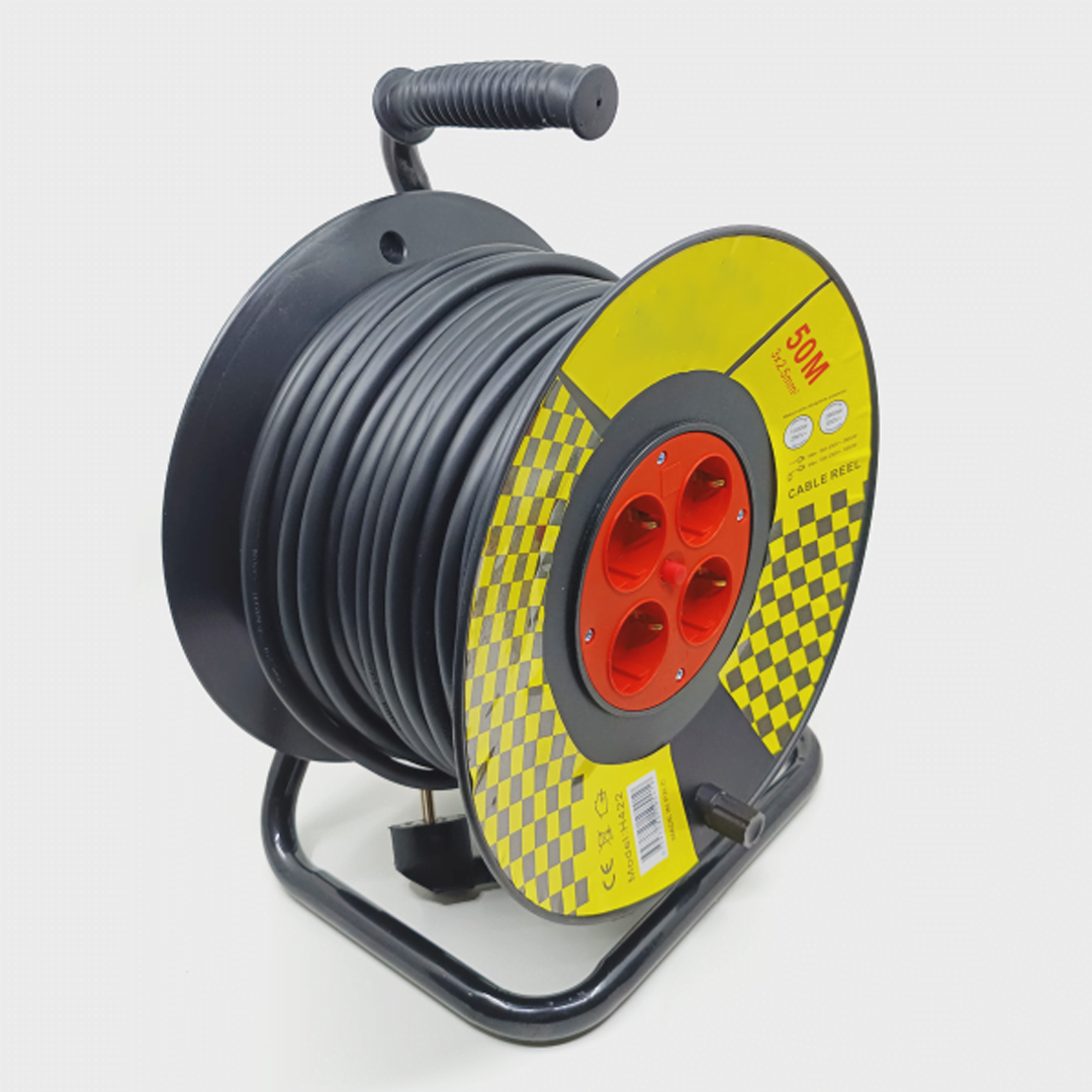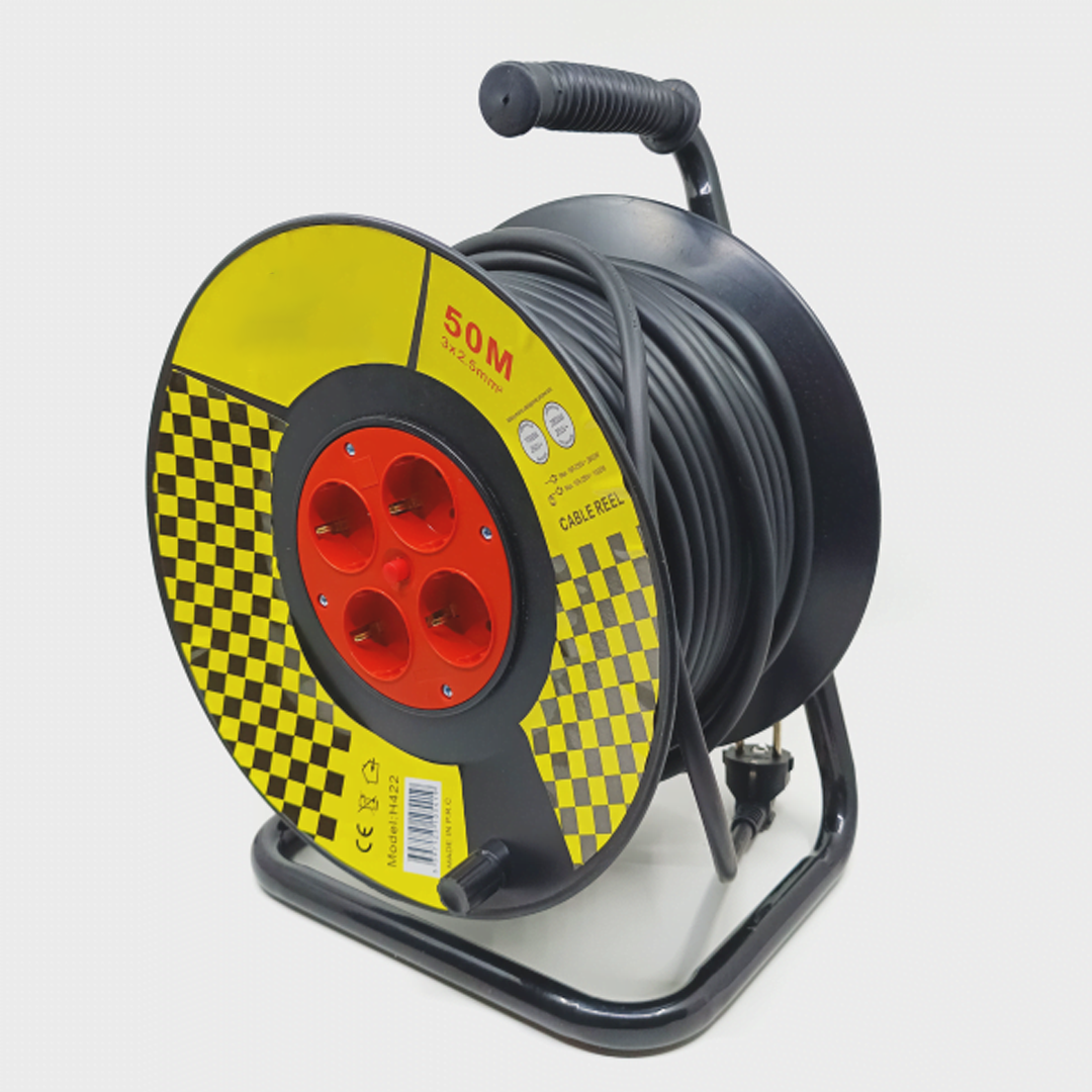 🔄 Лесното навиване и развиване се улеснява благодарение на дръжката с кръгъл захват на ролката за удължителен кабел. Металната поставка осигурява стабилност и вертикално поставяне на ролката. докато дръжката е проектирана за удобно носене на строителното място или за съхранение на ръка в гаража.