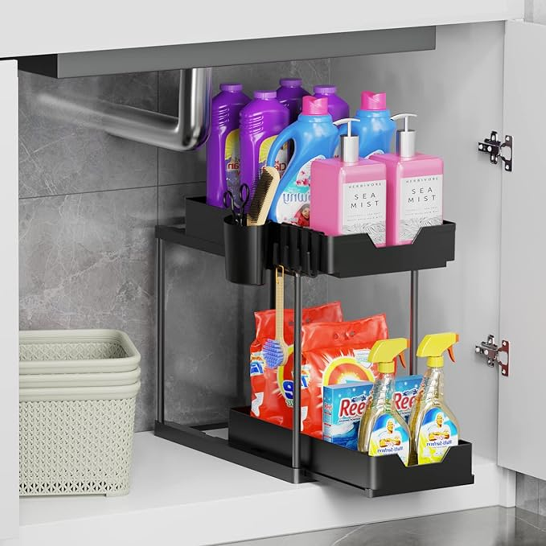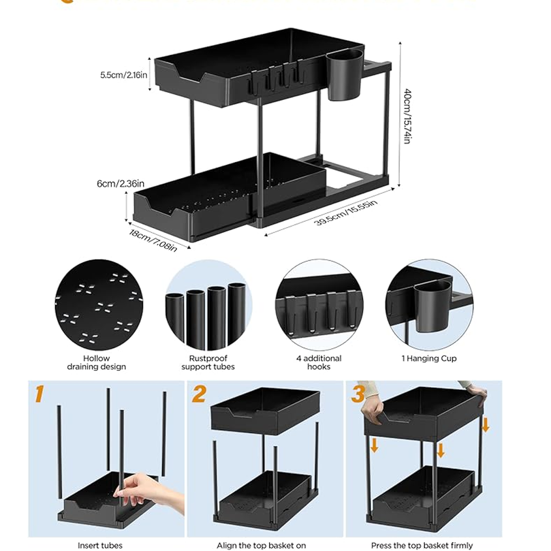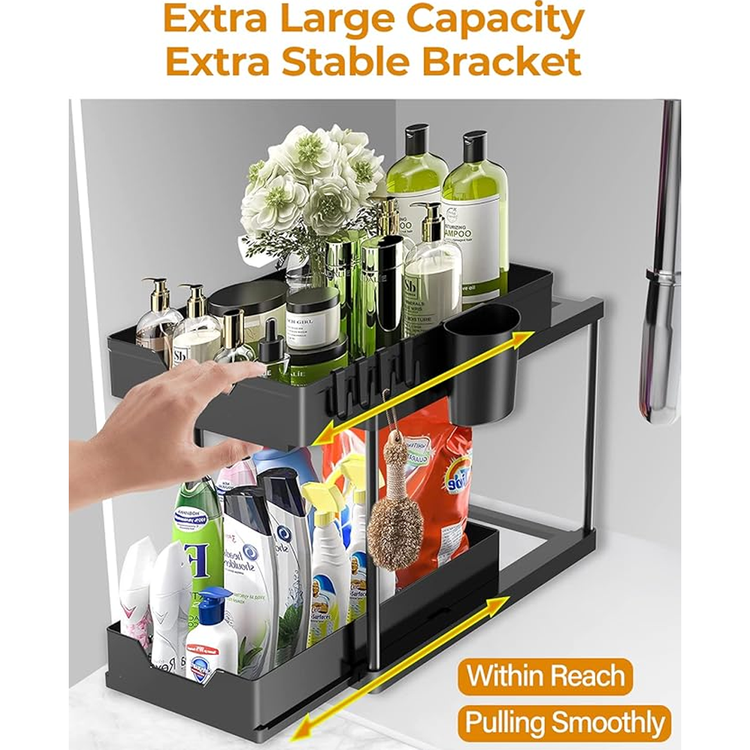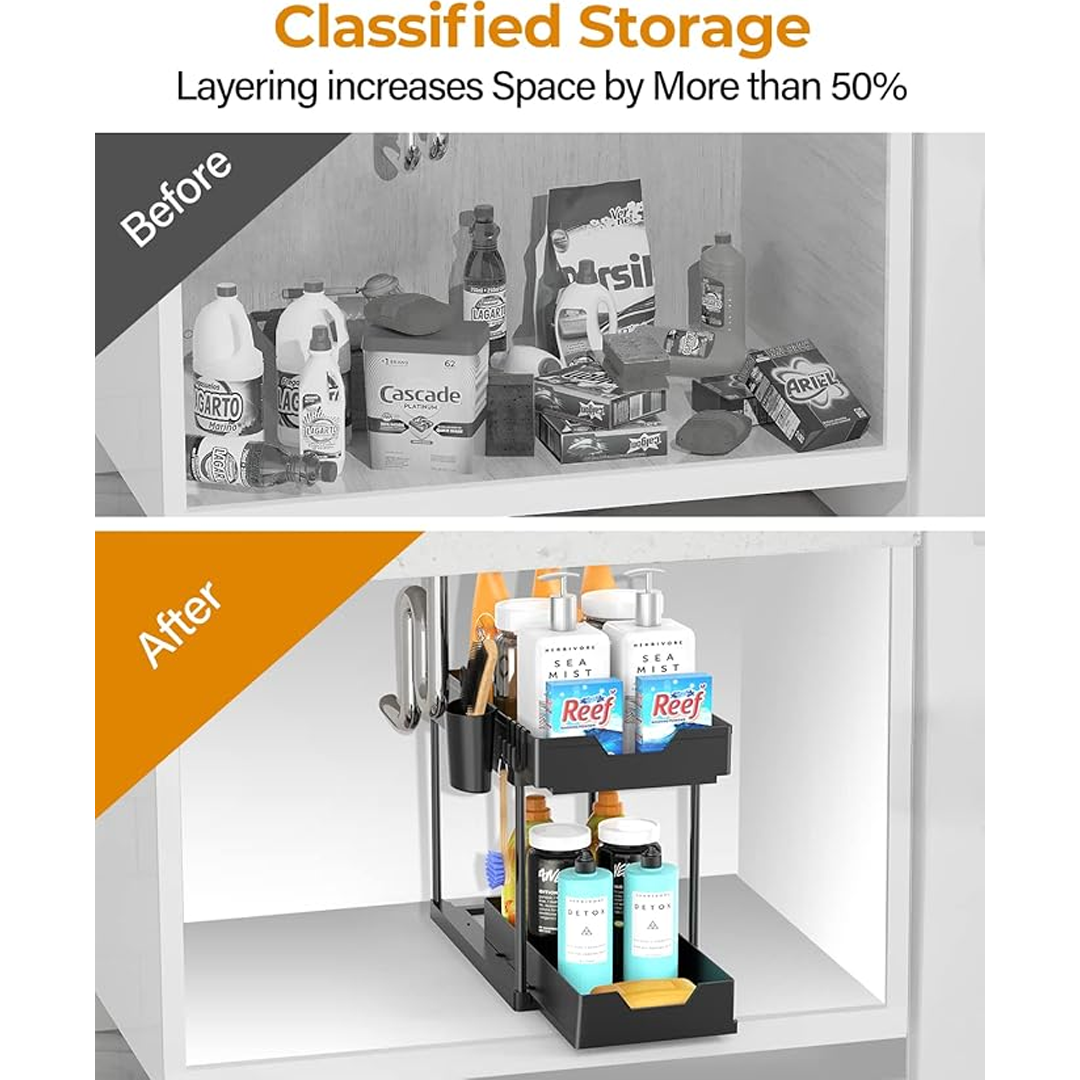 Този многократен органайзер за шкафчета под мивка е идеален за всеки, който желае максимално използване на пространството и подреденост на вещите си, като ги прави лесно достъпни.